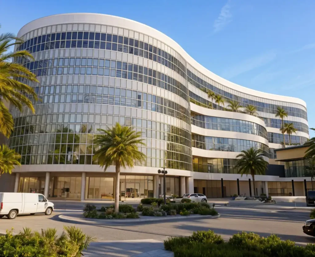 The client requested a unique architectural design for this building. It was designed radially to include corridors on the outside with waiting areas where appropriate, and the examination rooms with their facilities on the inside. Each clinic takes on one circular center per floor on either side, and the central circular form is dedicated for circulation and services. Each clinic is entered through a designated reception and waiting area, offices for its medical staff, and each clinic is physically separated from the other for privacy purposes and circulation clarity. The medical center also accommodates a large lecture hall and auditorium and is connected by two bridges to the adjacent old clinic and the multi-story parking on the opposite side. The project reflects the latest trends in healthcare architecture, modern building design, and sustainable architecture.